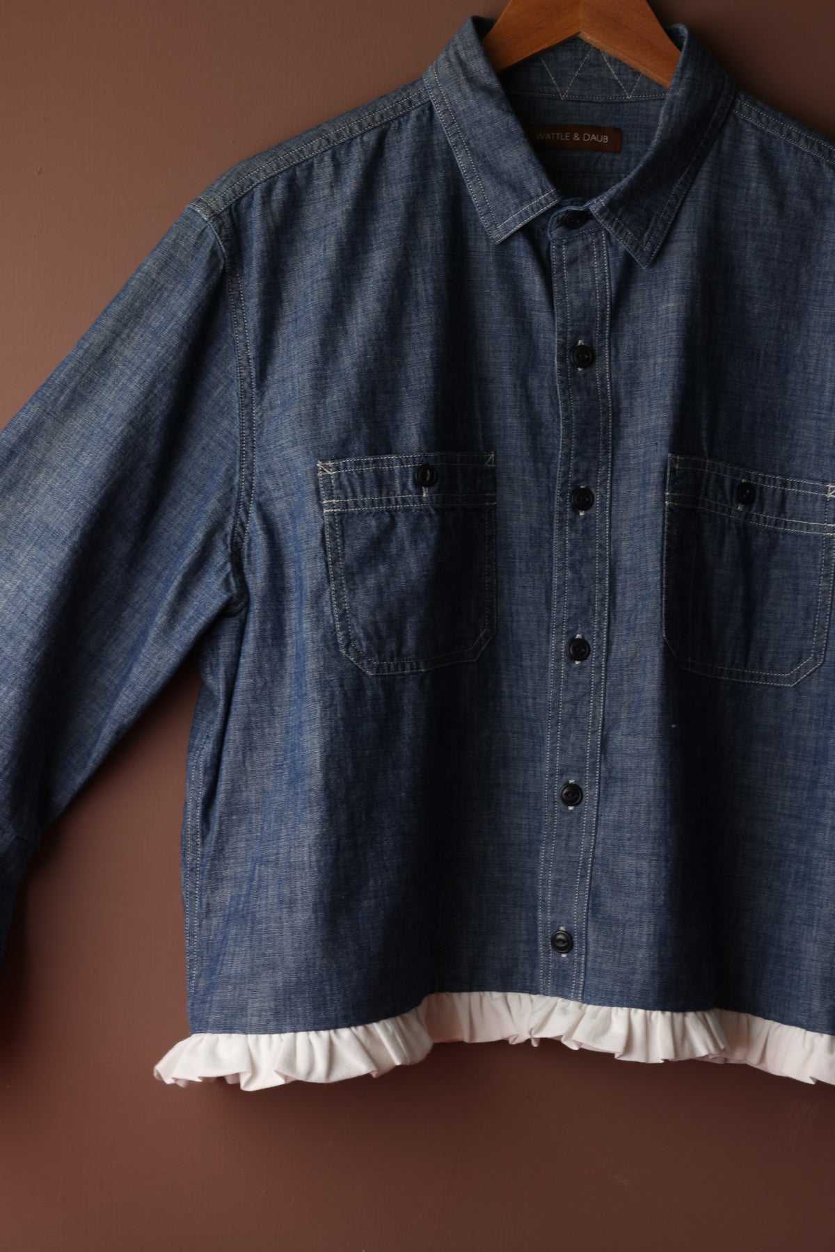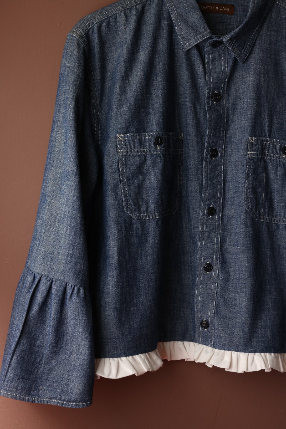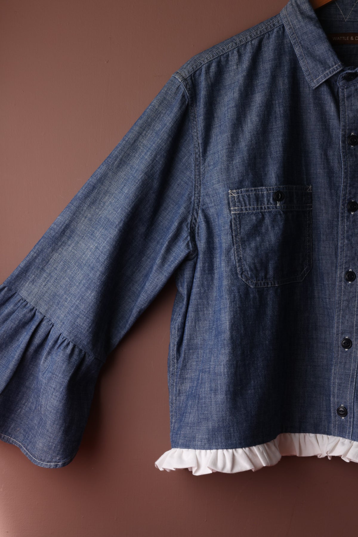 We have refashioned this gorgeous pre-loved cotton denim Gentleman's shirt into a stylish wardrobe staple. It has a flared sleeve and contrasting white linen hem frill.